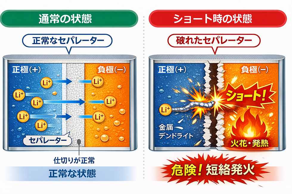 経年劣化で電解液中に出来るデンドライトと言われる結晶や、外部からの強い衝撃などが加わると+と-を仕切っているセパレーターと言う壁を破ってしまい、両極が直接つながる事で大量の電流が一気に流れて急加熱が始まります。制御機能を介さない内部での加熱になるので温度上昇は止まりません。